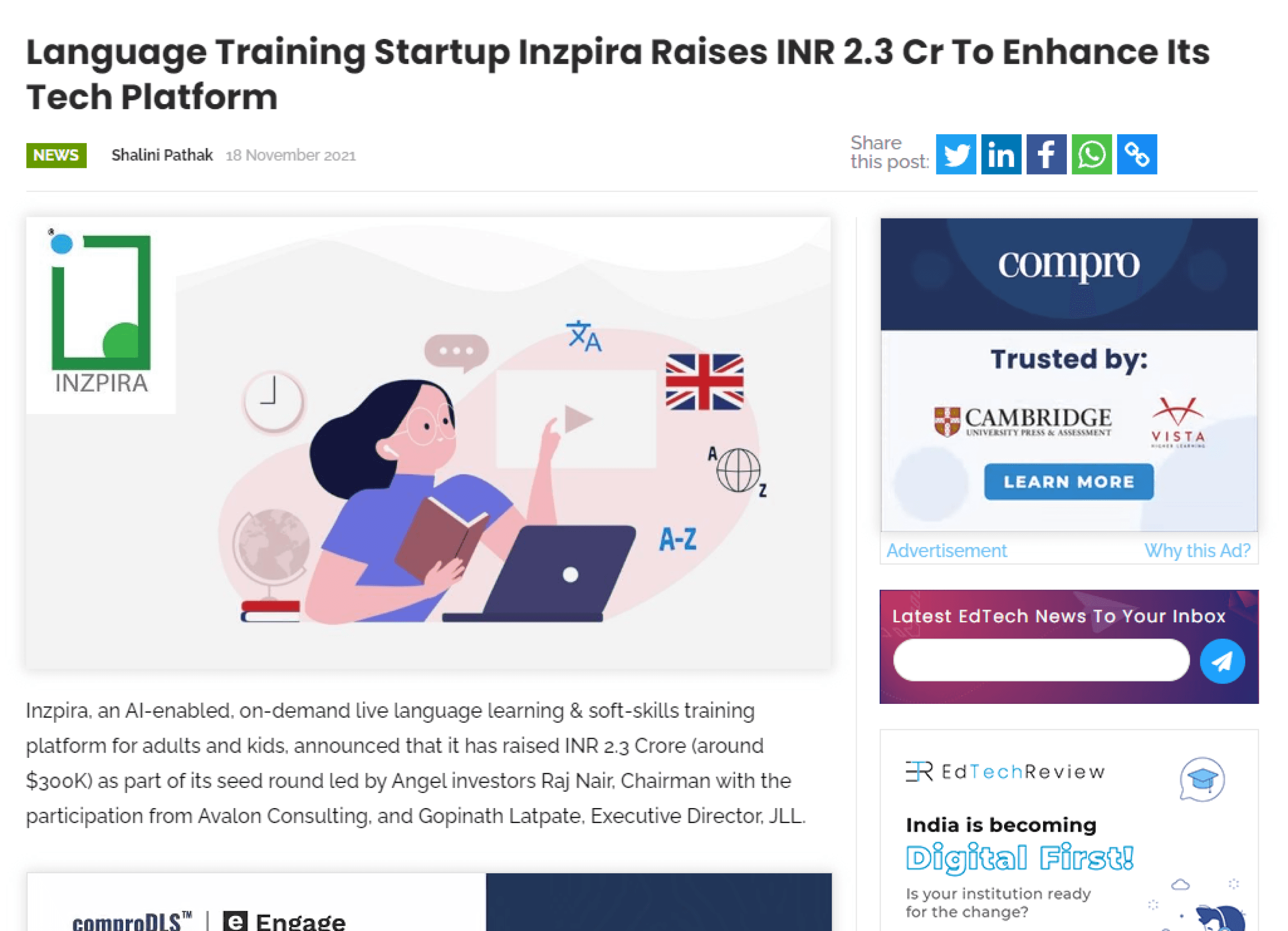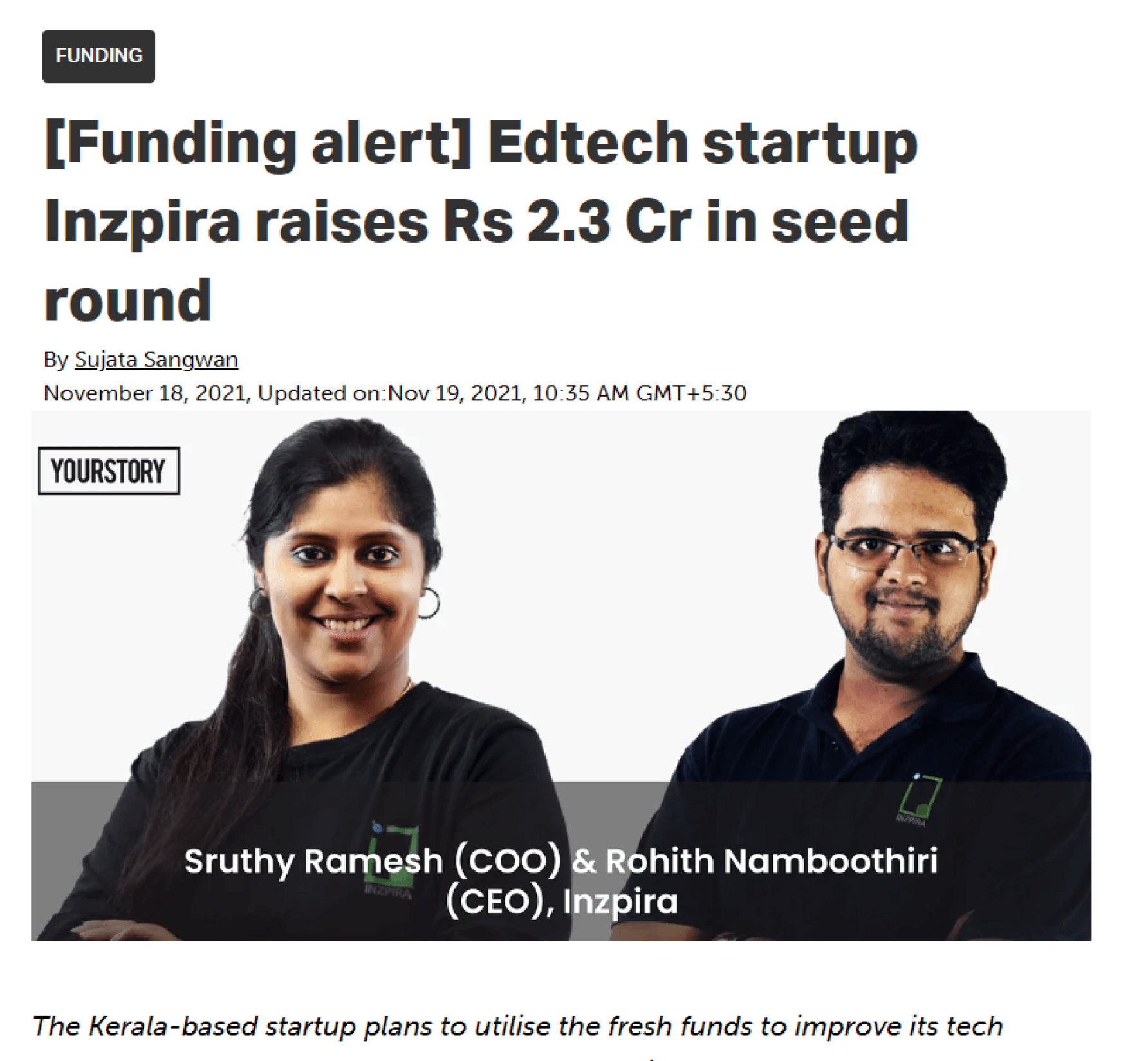 After visualizing the product and assembling our product development team, Inzpira was able to secure a seed funding of INR 2.3CR from Avalon Capital.