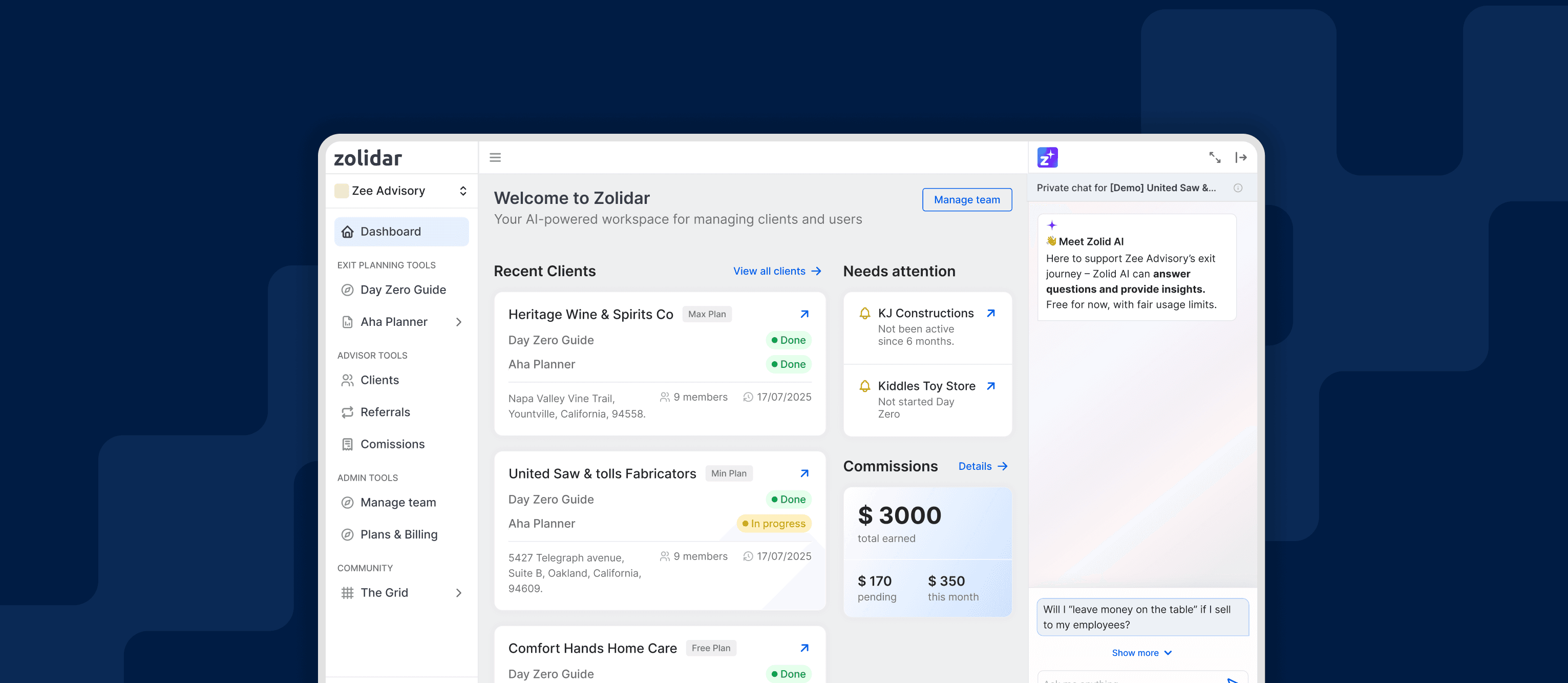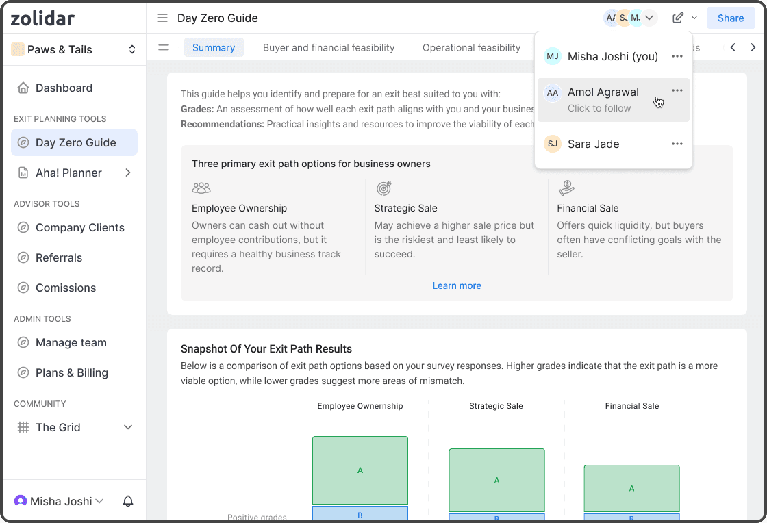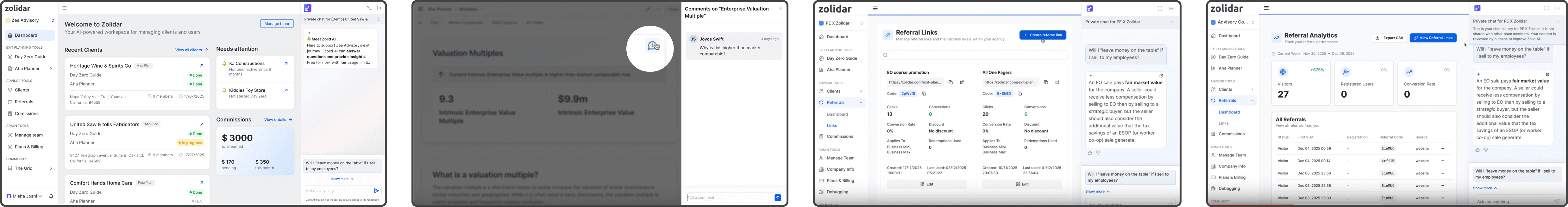The Advisor Tier is a core part of Zolidar, designed to support professionals guiding business owners through exit planning and employee ownership transitions. I led the design and project management of the advisor experience, focusing on structuring client workflows, building a collaborative space for advisors and clients to work together, and embedding growth tools directly into the platform while aligning with Zolidar's business model.