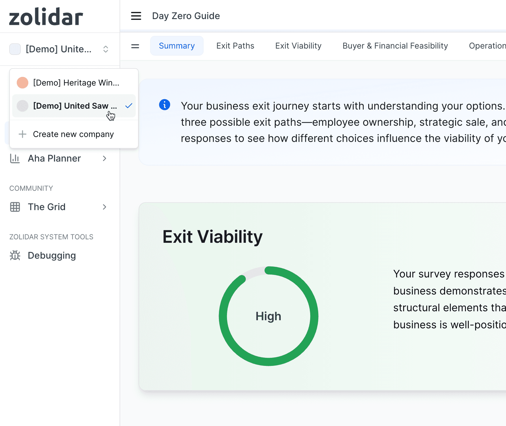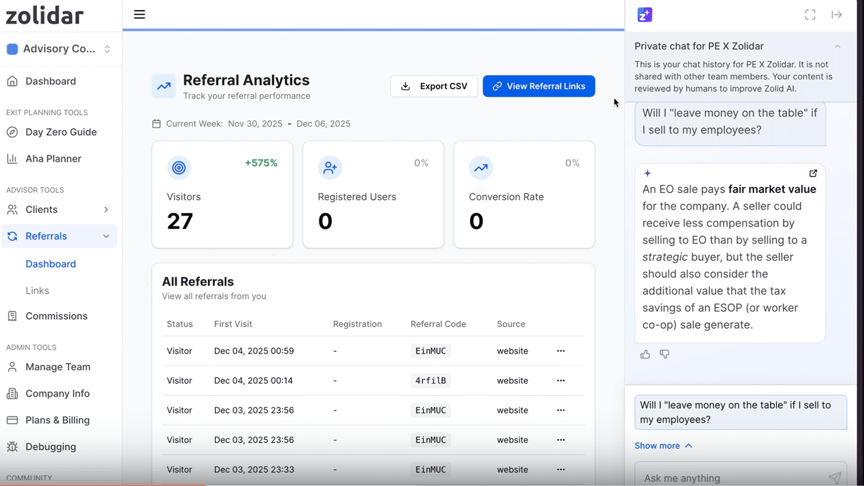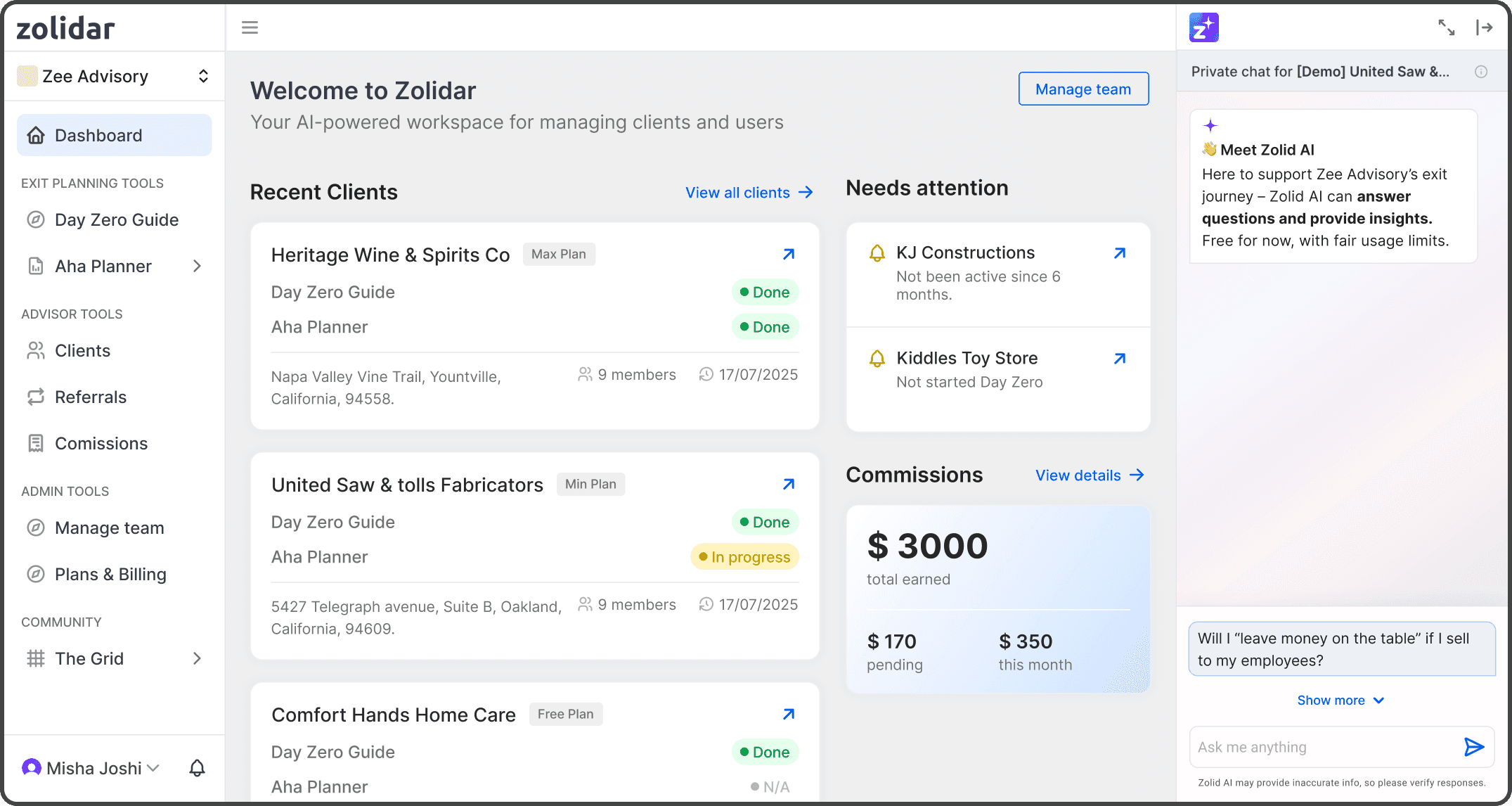 The Advisor Tier is a core part of Zolidar, designed to support professionals guiding business owners through exit planning and employee ownership transitions. I led the design and project management of the advisor experience, focusing on structuring client workflows, building a collaborative space for advisors and clients to work together, and embedding growth tools directly into the platform while aligning with Zolidar's business model.