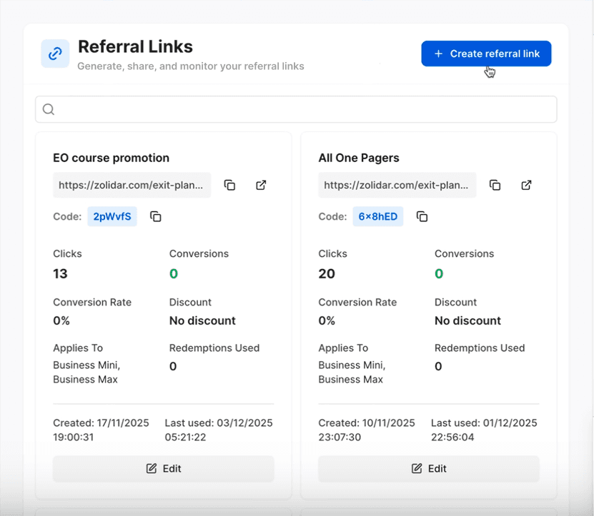 Advisors already had the trust. The referral system gave them a way to act on it, managing commissions, setting client discounts, and tracking it all from one place inside the Zolidar platform.