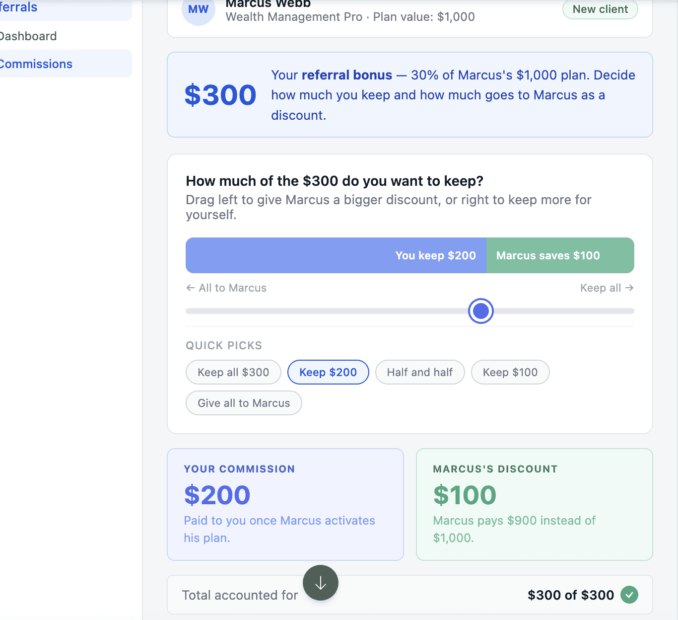 That is why we built a referral system directly into the advisor workflow, giving advisors full control over how they split commissions and discounts, and a dedicated dashboard to track it all without switching tools.