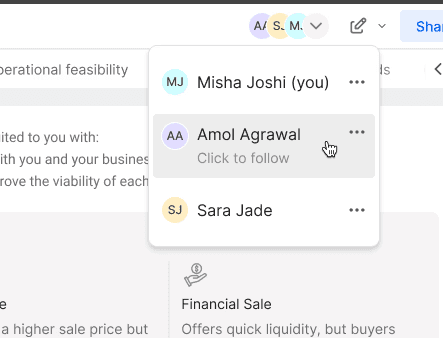 A real-time collaboration feature showed when someone else was viewing a report, with the ability to follow that person through the reports, similar to how Miro handles live collaboration.