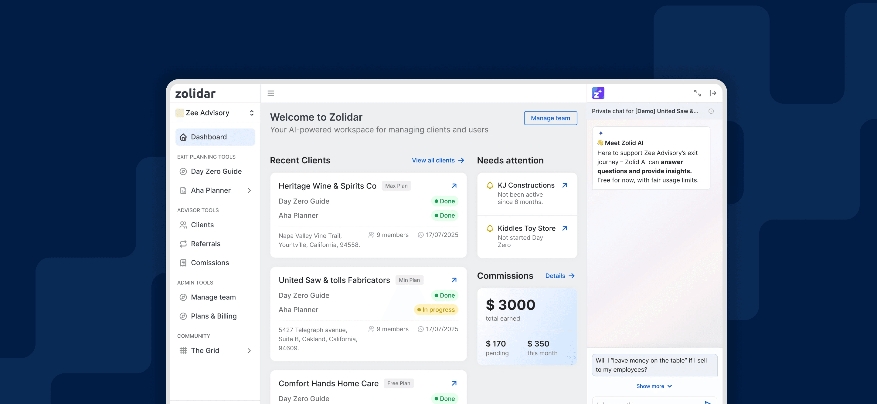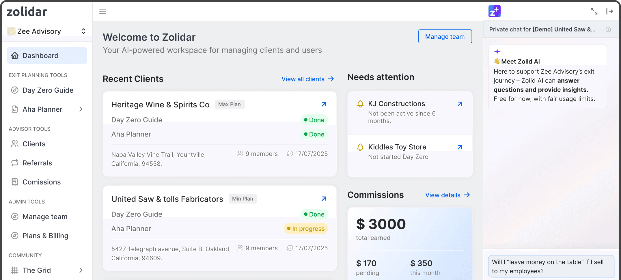 The Advisor Tier is a core part of Zolidar, designed to support professionals guiding business owners through exit planning and employee ownership transitions. I led the design and project management of the advisor experience, focusing on structuring client workflows, building a collaborative space for advisors and clients to work together, and embedding growth tools directly into the platform while aligning with Zolidar's business model.
