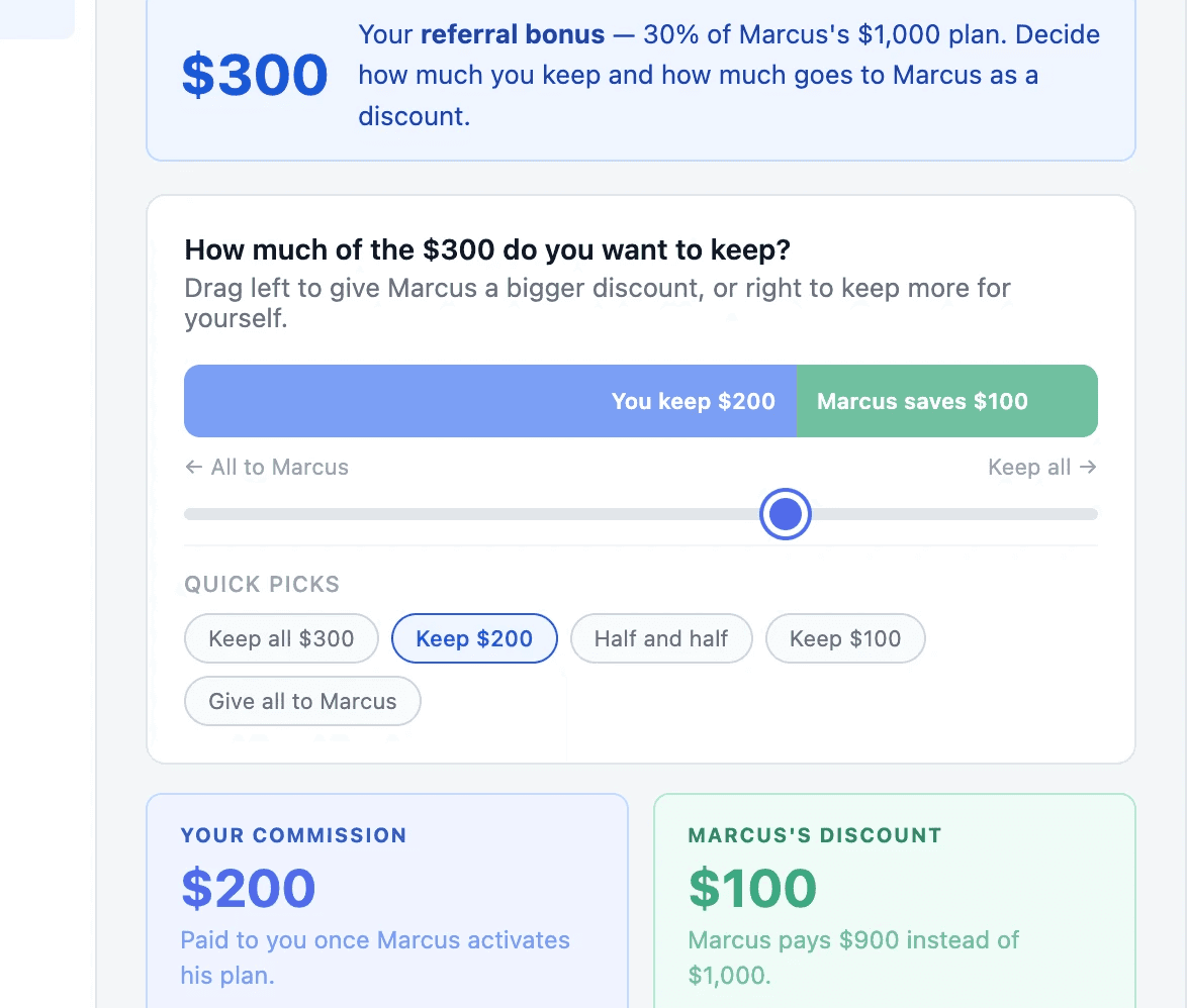 That is why we built a referral system directly into the advisor workflow, giving advisors full control over how they split commissions and discounts, and a dedicated dashboard to track it all without switching tools.